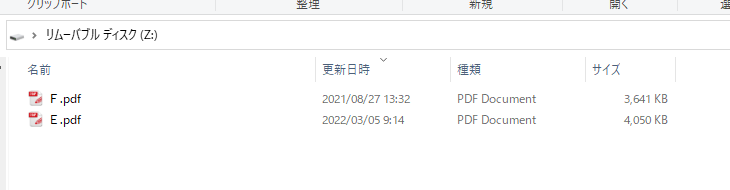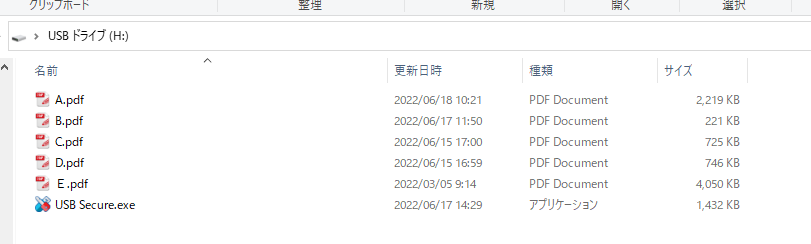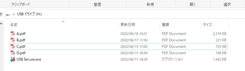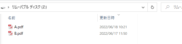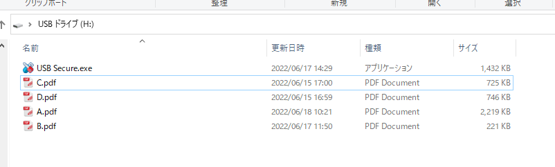 例として、A,B,C,D名のpdfファイルを他のドライブからコピーして、USBメモリドライブ(ここではHドライブ)に転送して、状態遷移を説明します。