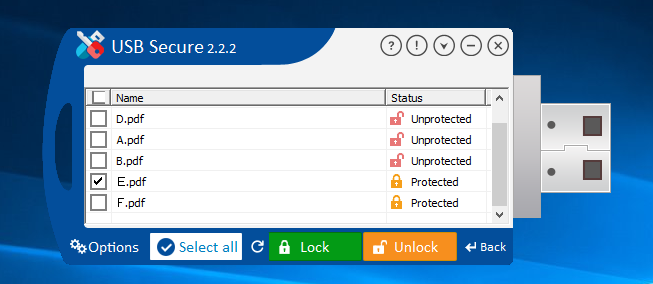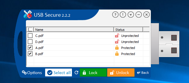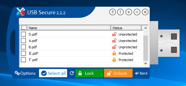 ここで、標準画面の「Select/Unselect」ボタンをクリックすると、USBドライブ内に格納されているファイルがステータス(保護/非保護の状態)と共にリスト表示されます。