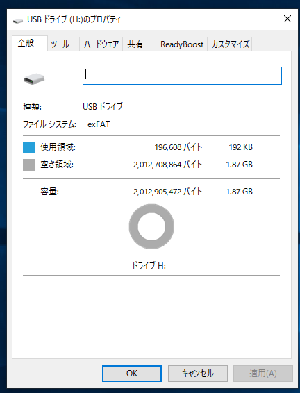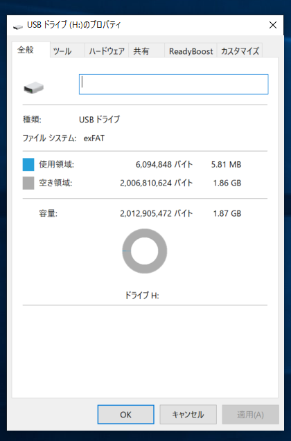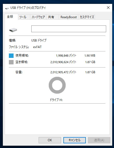 この例では、USBメモリ容量は2GBで、ドライブ番号はHとなっている。