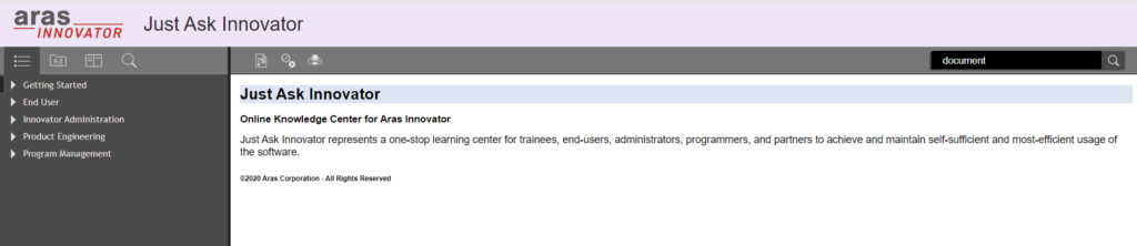 操作説明は、Aras Innovatorの画面のヘルプ(Just Ask Innovator(オンラインヘルプ))から参照できますが、英語であり、また、項目説明主体で、判りやすいものではありませんが、情報は入手できます。