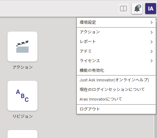 Aras Innovator を起動すると、画面右側上部にログイン者アイコンが表示されています。このアイコンをクリックするとドロップダウンリストが表示され、その項目の中に