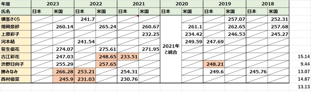 なお、日本の女子プロで、日米でのドライビングディスタンスのデータを並べてみました。2023年の米国データは、6月12日の閲覧データです。