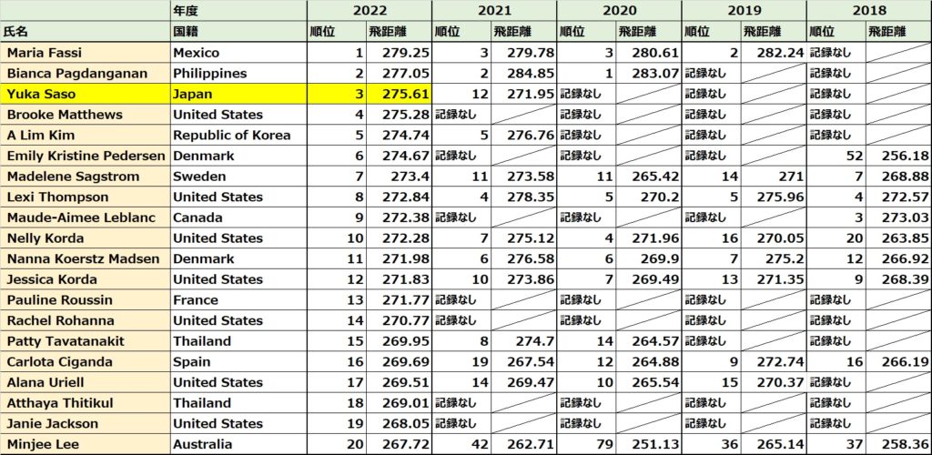 また、2022年度のトップ20名の過去4年間(計5年間)の飛距離推移表を以下に示します。